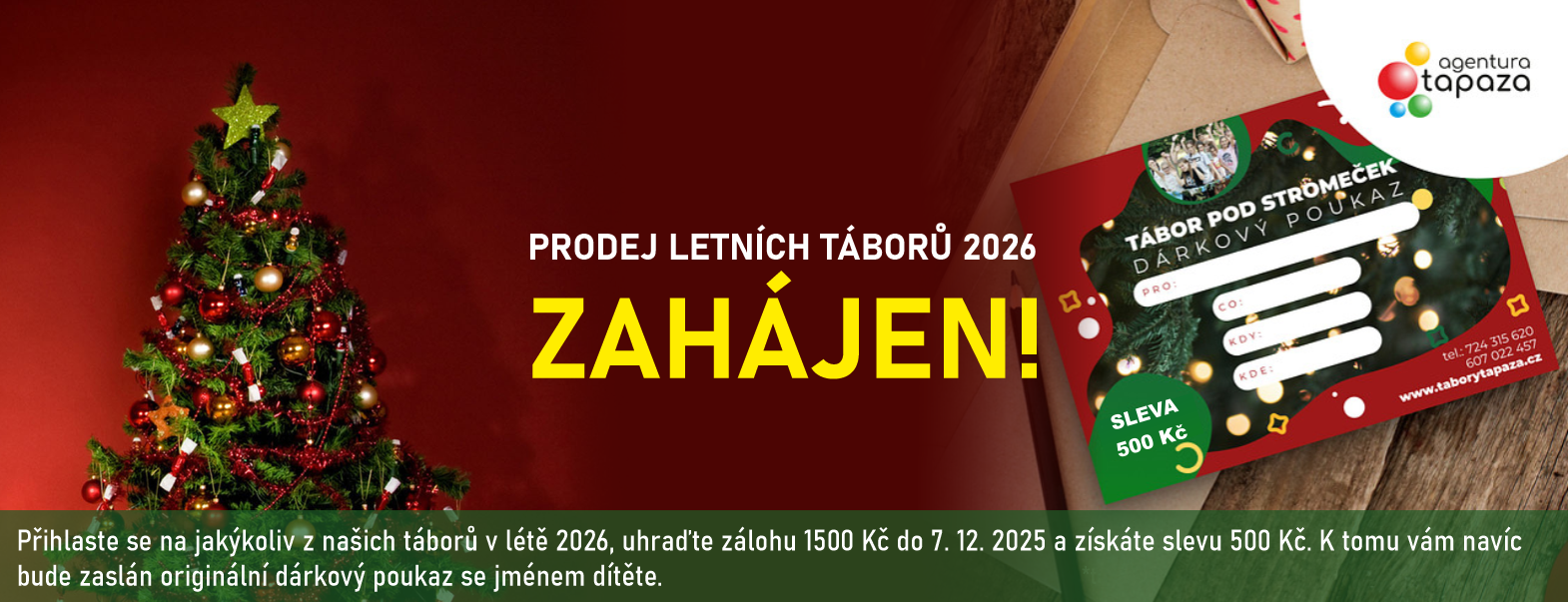 Přihlaste se na tábor, zaplaťte zálohu 1500 Kč do 7. 12. 2025 a obdržíte od nás poukaz "tábor pod stromeček" se jménem dítěte. Navíc budete mít slevu 500 Kč!